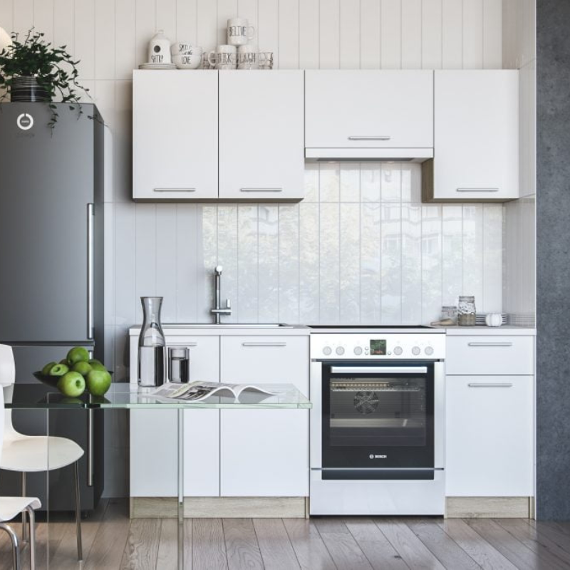 Kuhinja Sophia 1,8m u bijeloj boji idealna je za manje prostore, nudi funkcionalan raspored ormarića i visoku kvalitetu materijala. Bijela boja unosi svježinu, a otpornost površine omogućava dugotrajan i jednostavan rad.