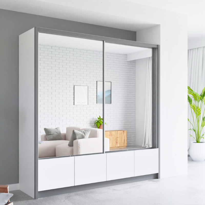 Ormar Lui 1 prostran je i funkcionalan ormar modernog dizajna, dimenzija 204x217x62 cm. Nudi dovoljno prostora za organizaciju odjeće i drugih potrepština, čineći ga idealnim rješenjem za spavaću sobu. Dostupan uz opciju plaćanja na 36 rata po 35 KM.