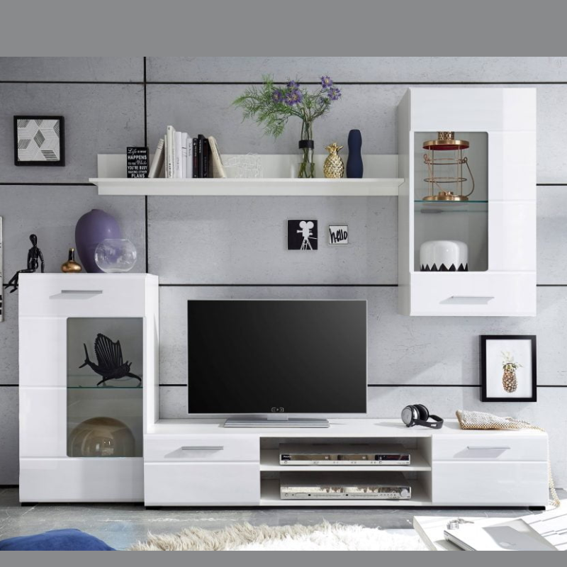Regal Perla u bijelom visokom sjaju sastoji se od TV komode (175x40x32 cm), viseće komode (55x101x33 cm), komode (55x101x33 cm) i police (138x19x20 cm). Moderan dizajn i kvalitetna izrada čine ga savršenim dodatkom za svaki dnevni boravak.
