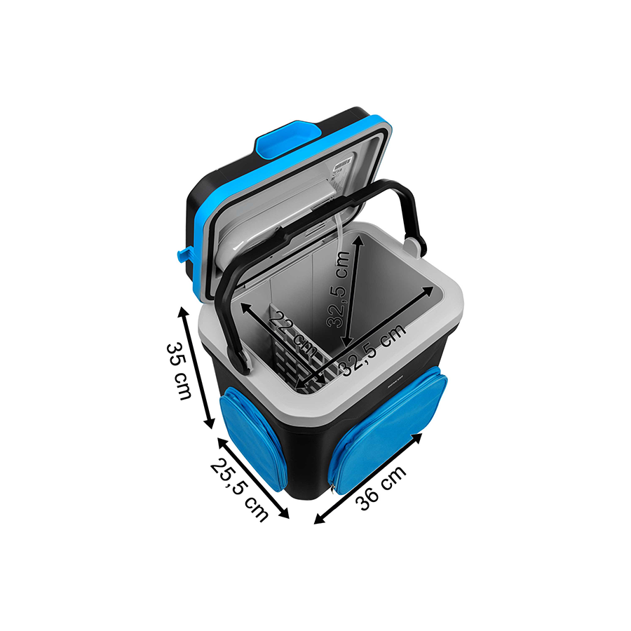 | Putni hladnjak | Suvremen dizajn s kapacitetom od 24 litre Mogućnost hlađenja i grijanja 3 praktična džepa sprijeda i dva bočna za držanje putnog pribora Za upotrebu u automobilu i kućanstvu (dvostruko napajanje 12/230V) Zeleno/crevno LED svjetlo signalizira hlađenje ili grijanje Velika ručka za lako nošenje Priključak na utičnicu od 12V (automobilski upaljač) / utičnicu mrežnog napajanja od 230 V Način rada ECO kada se napaja s 230 V (hlađenje će prestati kada se dostigne 12 °C) Prostor z šest PET boca od 1,5 l ili pet PET boca od 2 l, kada je poklopac zatvoren. Hladi do 16-18 °C ispod okolne temperature |