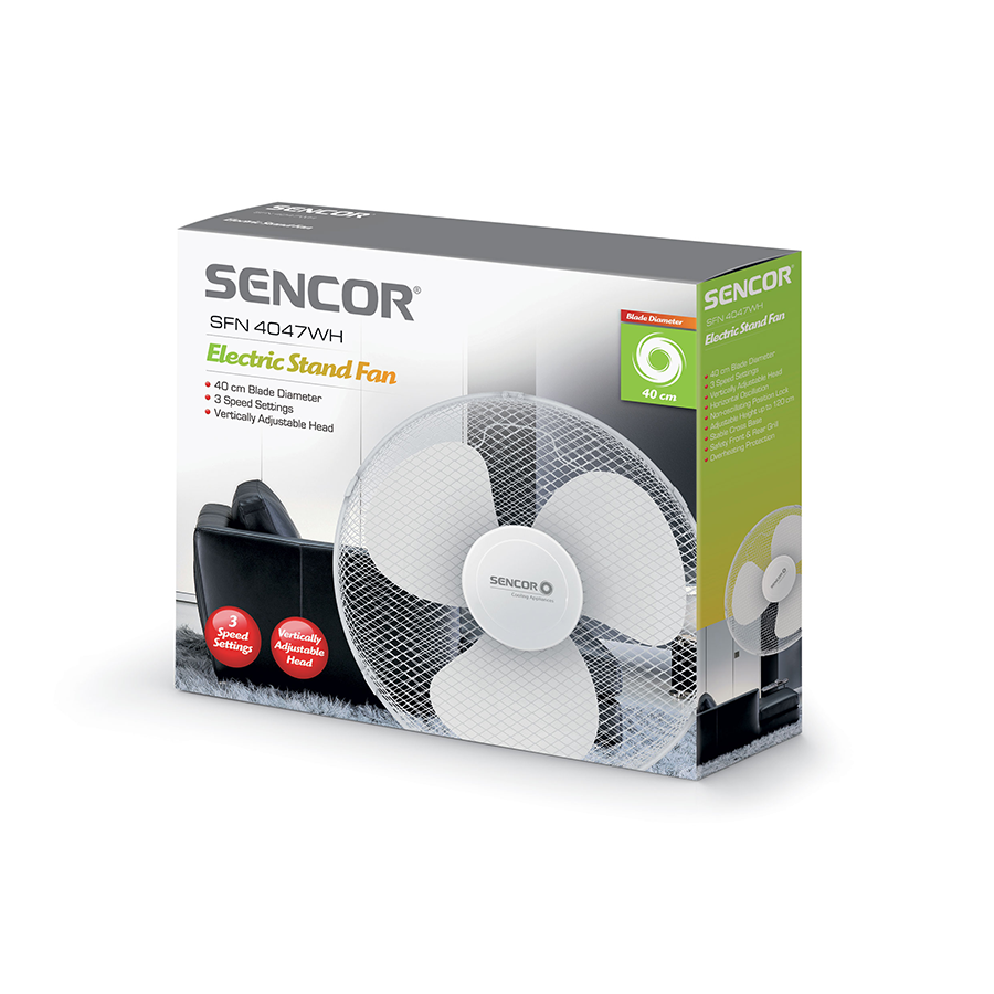 | Tehničke specifikacije | 3 brzine Promjer ventilatora 40 cm Automatsko horizontalno gibanje od 90 stepeni s mogućnošću isključivanja Podesivi kut nagiba Podesiva visina od 103 do 126 cm Stabilno križno postolje nožiice protiv klizanja Zaštita od pregrijavanja Ulazna snaga 50 W Nivo buke 50 dBA Dužina naponskog kabela: 1.6 m Dimenzije (ŠxDxV) 625 x 625 x 1260 mm Težina 2,7 kg Napon i frekvencija 220-240 V, 50 Hz |